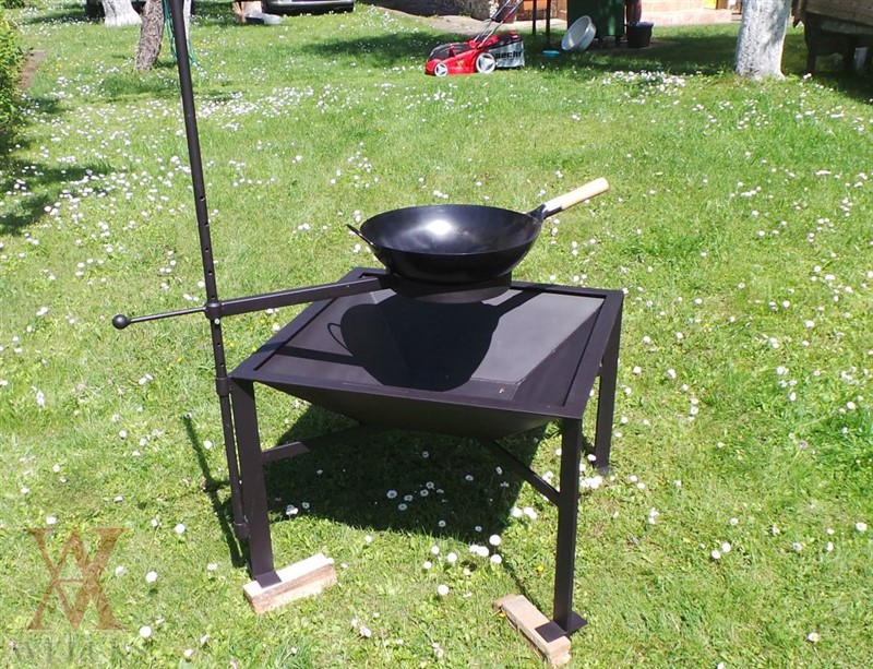 The garden fireplace with the holder for a copper and wok frying pan in a set.