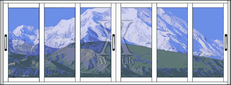 Aluminum sliding construction on three guides, six windows, opening - 70%.Size of construction: 6 x 1.5 m