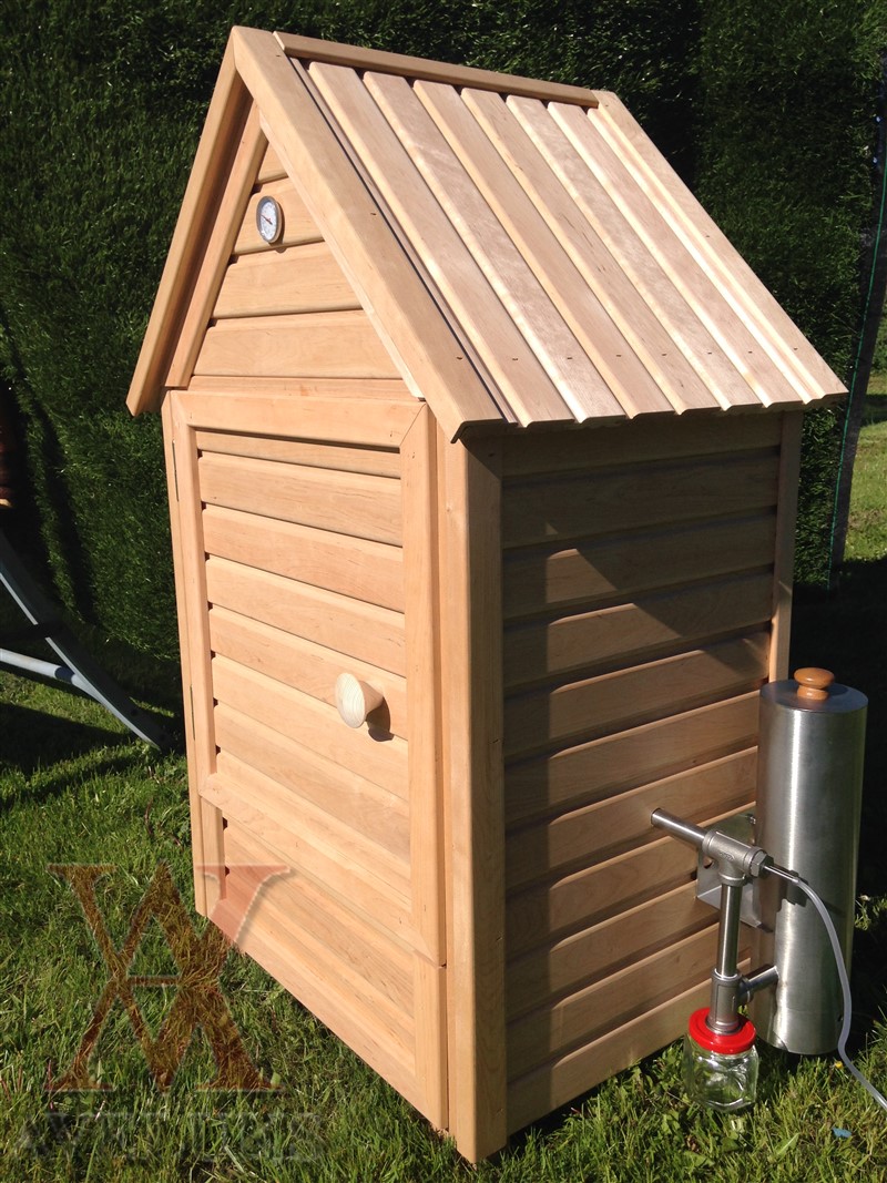 The house, made of black alder, has a door for loading products and a damper for smoke. Inside the house is equipped with jumpers for hanging products (2 pcs.). At the bottom of the house is a removable stainless steel tray for collecting fat and moisture.