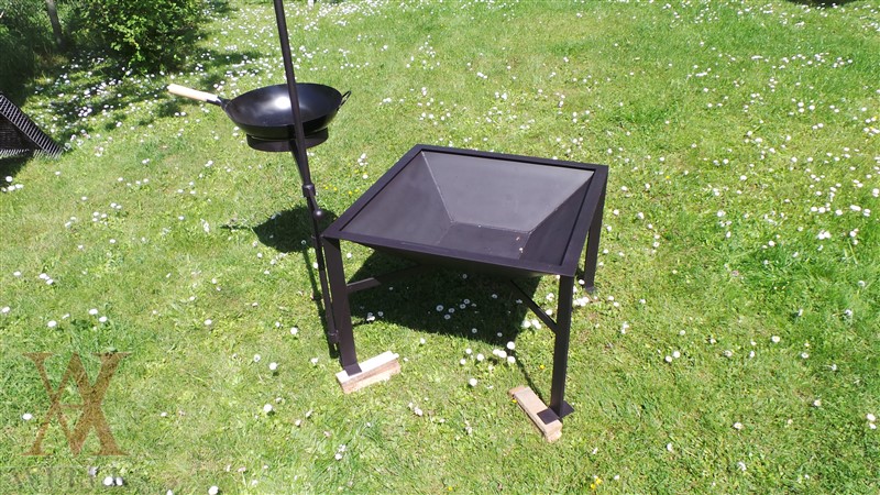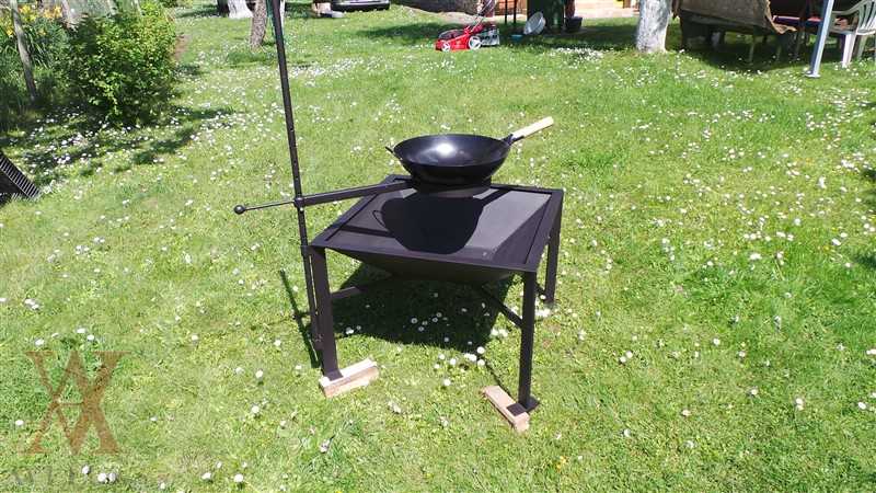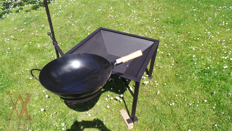 The garden fireplace with the holder for a copper and wok frying pan in a set.