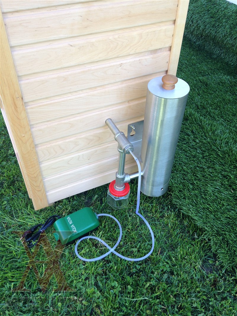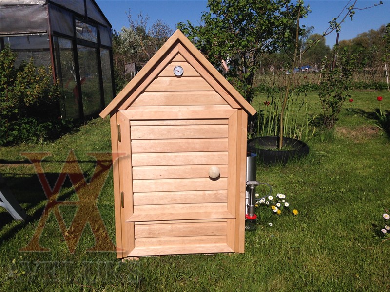 Smokehouse made of black alder, has a door for loading products and a damper for smoke. Inside the house is equipped with jumpers for hanging products (2 pcs.). At the bottom of the house is a removable stainless steel tray for collecting fat and moisture.